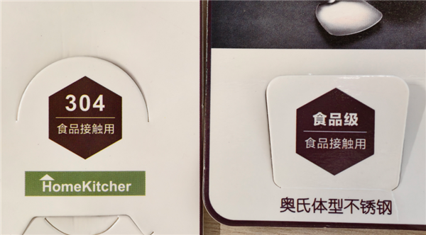 比如真食品级的不锈钢勺子,明确标明了304牌号,而另外的锅铲和锅勺,只粗略写了一个食品级字样。