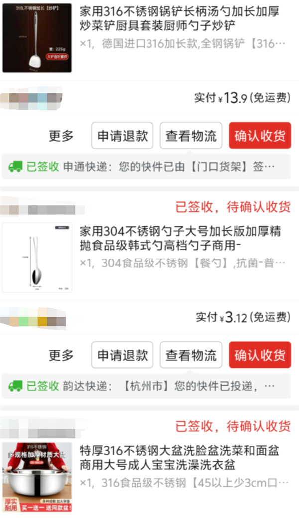 下面是我们分别在大家常用的某宝、某多两个线上平台和线下超市,采购的共计9件号称食品级的不锈钢产品。