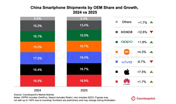 此外,调研机构Counterpoint Research也公布了2025年全年的中国手机市场出货量数据及排名,华为依然超越苹果,稳稳的排在第一,具体排名如下: