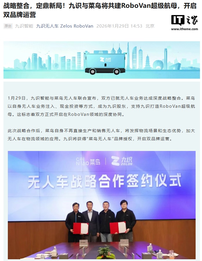 菜鸟与九识智能达成深度战略整合,自身不再直接生产和销售无人车